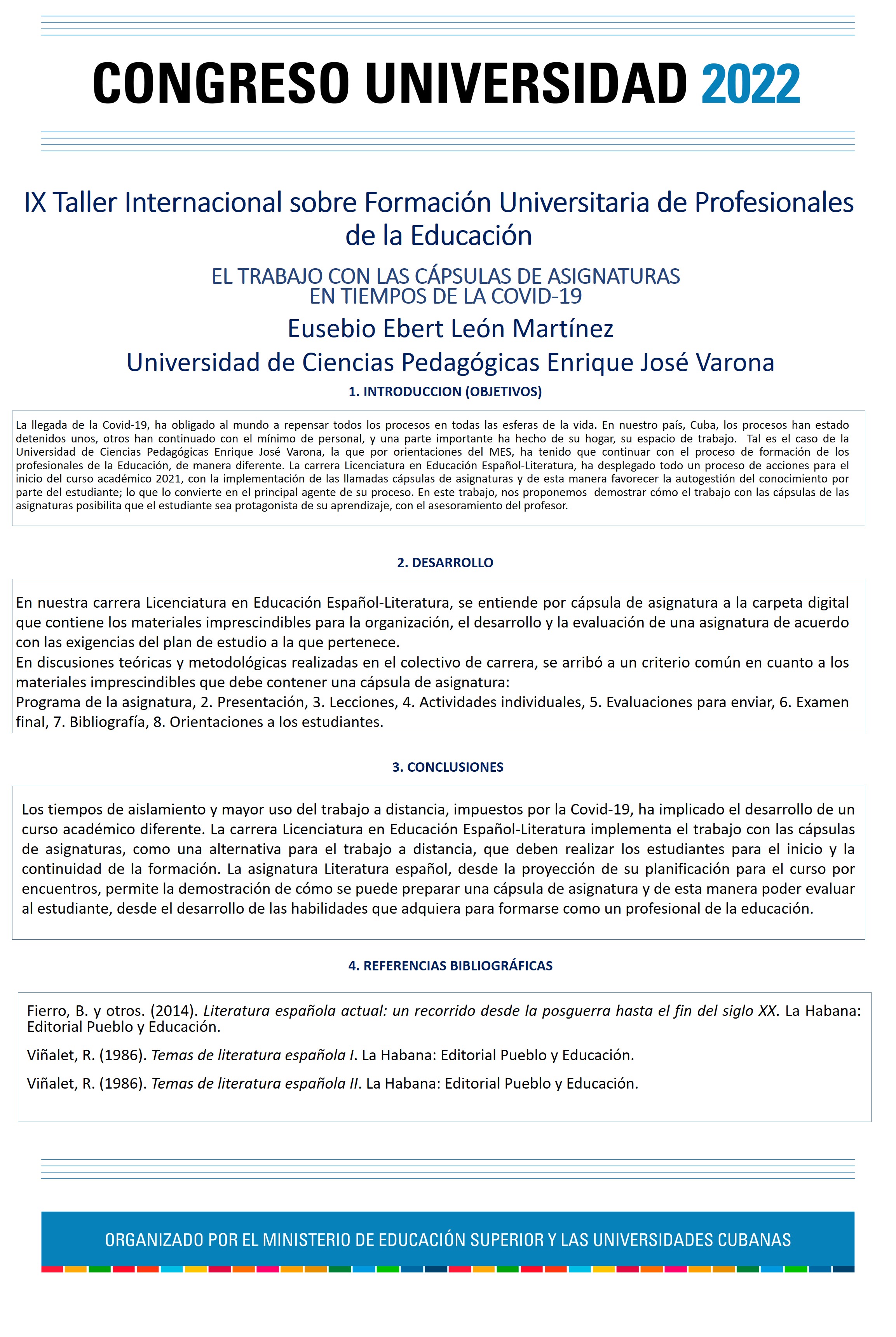 La llegada de la pandemia Covid-19, ha obligado a la enseñanza universitaria a pensar en nuevas maneras de desarrollar el proceso educativo para que no se detenga la formación del profesional. La Universidad de Ciencias Pedagógicas Enrique José Varona y la carrera Licenciatura en Educación Español-Literatura, no están ajenas a esta situación, por lo que se ha pensado las asignaturas del plan del proceso docente de manera diferente para sus implementaciones. En este trabajo se pretende demostrar cómo el trabajo con las cápsulas de las asignaturas posibilita que el estudiante sea protagonista de su aprendizaje, con el asesoramiento del profesor. Para ello, se ha tomado como ejemplo la asignatura Literatura española, que pertenece al currículo base, en la disciplina Estudios Literarios y se explicará cómo se ha concebido para que sea cursada por los estudiantes del curso por encuentros, y, de esta forma, proponer los ajustes pertinentes que posibiliten una mejor formación del profesor de Español-Literatura, en tiempos de Covid-19.