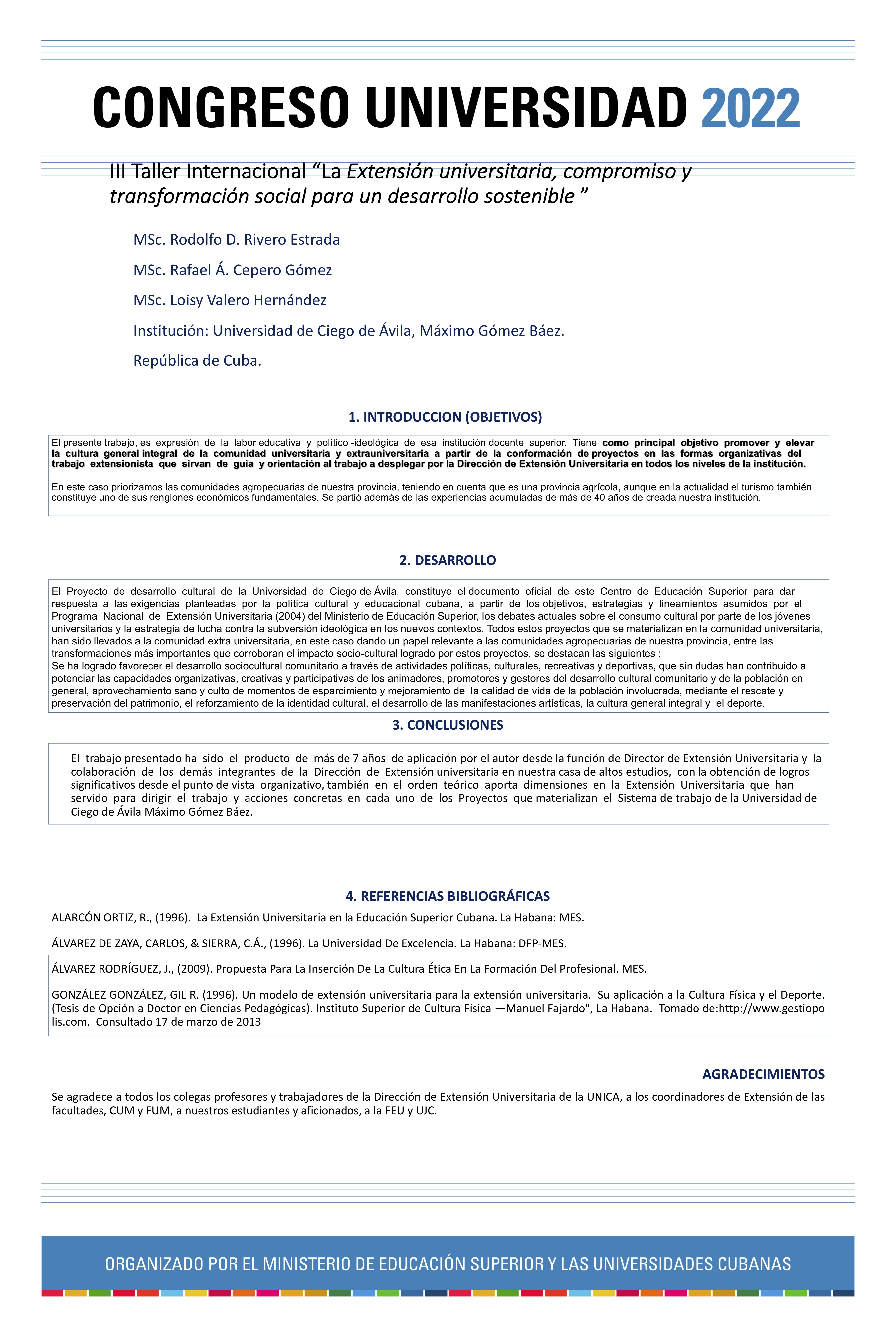 El presente trabajo titulado Impacto del accionar socio-cultural de la UNICA en las comunidades agropecuarias. Buenas prácticas, es expresión de la labor educativa y político -ideológica de esa institución docente superior. Tiene como principal objetivo promover y elevar la cultura general integral de la comunidad universitaria y extrauniversitaria a partir de la conformación de proyectos en las formas organizativas del trabajo extensionista que sirvan de guía y orientación al trabajo a desplegar por la Dirección de Extensión Universitaria en todos los niveles del trabajo, en este caso priorizamos las comunidades agropecuarias de nuestra provincia. En su elaboración se ha partido de la experiencia de más de 40 años de la Universidad, las condiciones actuales y las metas a alcanzar en la formación de los futuros profesionales del territorio para lograr la competencia y el compromiso que se exigen en la formación del estudiantado. El mismo también se ha apoyado en la experiencia en el trabajo de los principales directivos y profesores de la Dirección de Extensión Universitaria.