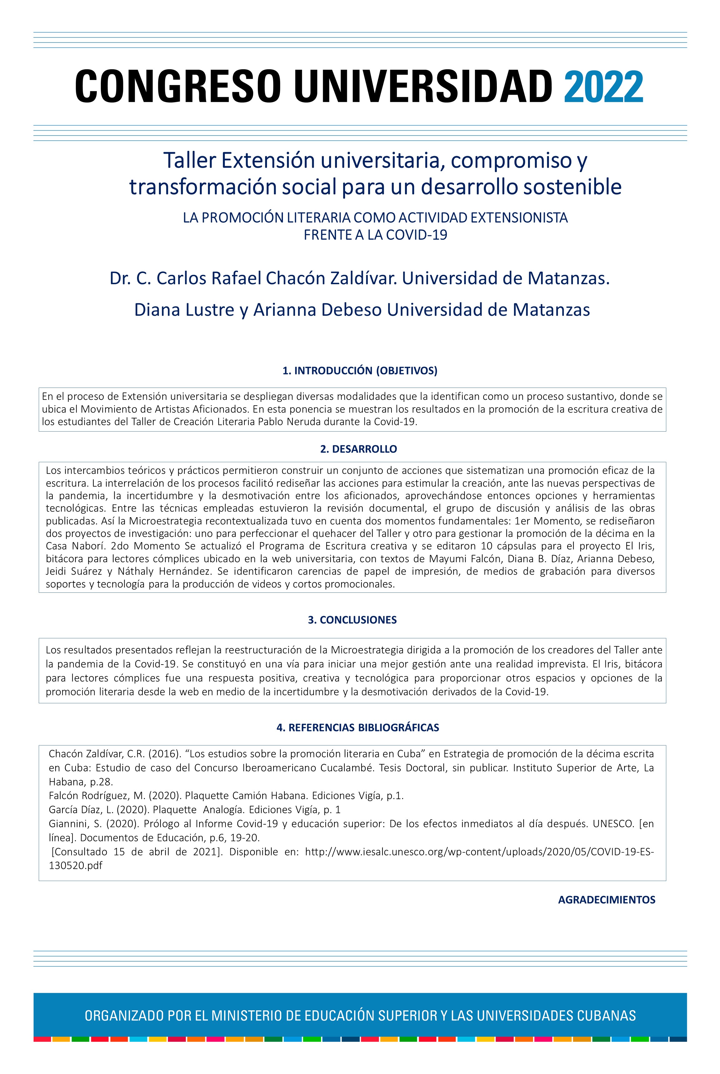In the process of university extension, various modalities are deployed that identify it as a substantive process of Higher Education, within which the attention to students with literary concerns included in the Amateur Artists Movement is located. In this sense, work has been done on the design and application of a promotional strategy for such an important movement in all its artistic manifestations. This task constitutes a teaching and research work with a strong influence on the integral formation of university students. This presentation reflects the results in the promotion and socialization of the creative writing of fans linked to the Pablo Neruda Literary Creation Workshop in the face of the critical situation caused by Covid-19. Among the most outstanding actions are: the debate of written works, collective readings, book presentation, preparation and visualization of promotional capsules, whose contents demonstrate the knowledge, skills and experiences acquired, while enriching the cultural life of Matanzas and its University, while continuing the preparation stage with a view to the XXV National Festival of Amateur Artists, based in Matanzas.